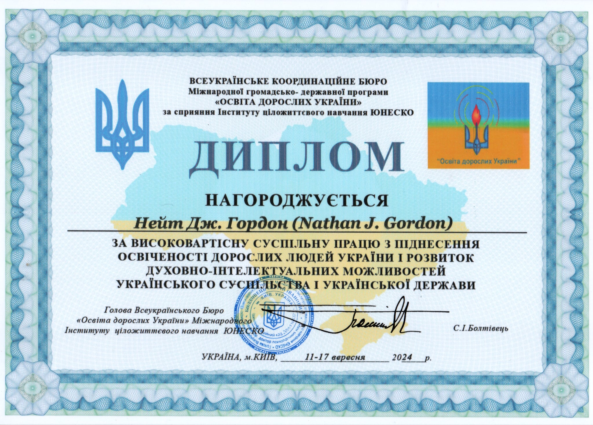 On September 17, 2024, the All-Ukrainian Coordination Bureau of the International Public-State Program “Adult Education in Ukraine” with the support of the UNESCO Institute for Lifelong Learning, awarded Nate Gordon a diploma for his valuable social work in raising awareness among adults in Ukraine and developing the spiritual and intellectual potential of Ukrainian society and the Ukrainian state.