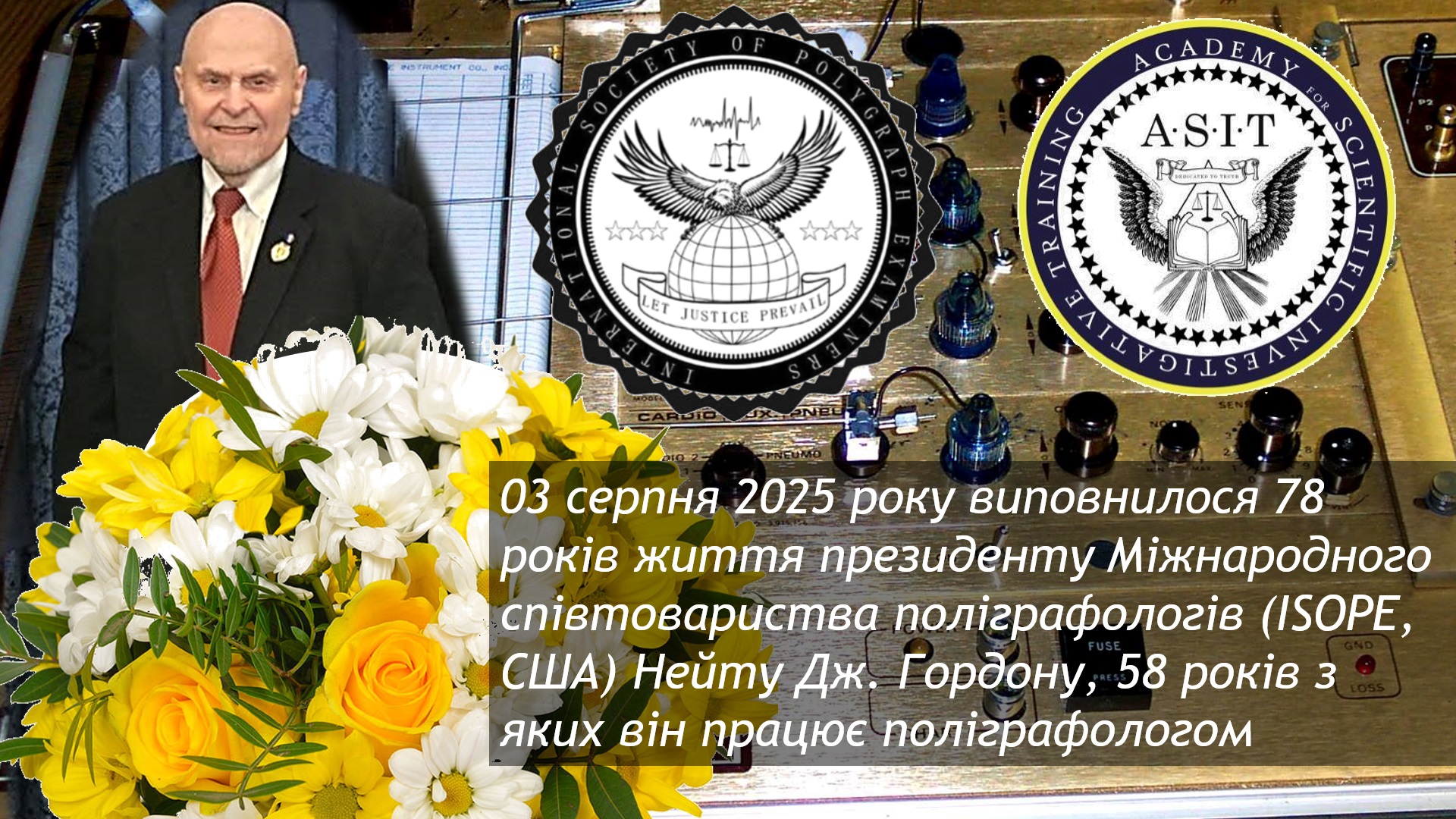 President of the International Society of Polygraph Examiners (ISOPE, USA) Nathan J. Gordon was born on August 3, 1947. In 2025, he celebrated his 78th birthday. N. Gordon has devoted most of his life to research on the use of polygraphs, and began his professional career as a polygraph examiner in 1967. In 2025, he will have 58 years of professional experience. The editorial board of the journal and editor-in-chief Oleh Nazarov sincerely congratulate the president of the International Society of Polygraph Examiners (ISOPE, USA) Nathan J. Gordon on his personal holiday - his birthday. We always remember and are proud that Nate is an ethnic Ukrainian and has family ties to Ukraine and Ukrainians in particular. Nate Gordon's support for the development of polygraph in Ukraine greatly helps Ukrainian polygraph examiners and strengthens our confidence in unity with the help of N. Gordon and polygraph examiners from around the world within the International Society of Polygraph Examiners, which is headed by N. Gordon has been president since 2013 and brings together polygraph examiners from more than 24 countries around the world. Nate Gordon has also been director of the Academy for Scientific Investigative Training (ASIT) since 1982. We wish you good health, peace to all of us, and support from our loved ones, all the best in your life, and success!!! Happy holiday! From Ukrainian polygraph examiners, participants in ISOPE webinars Oleh Nazarov, ISOPE representative in Ukraine.
