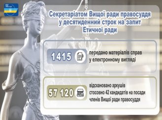 10 серпня 2022 року секретаріат Вищої ради правосуддя завершив передання Етичній раді копій матеріалів стосовно 44 кандидатів на посаду члена ВРП, що можуть сприяти встановленню їх відповідності критеріям професійної етики і доброчесності. Зокрема, на запит Етичної ради в електронному вигляді передано 1415 матеріалів справ за скаргами, які надходили до ВРП у попередні роки стосовно 42 кандидатів на посаду члена Ради. У стислі строки співробітниками секретаріату відскановано 57 120 аркушів справ (дисциплінарні скарги, додатки до скарг, рішення, прийняті ВРП, її органами та членами Ради, тощо). Стосовно двох кандидатів не надходили скарги до ВРП. Уся запитувана інформація передана Етичній раді у встановлений законодавством десятиденний ...