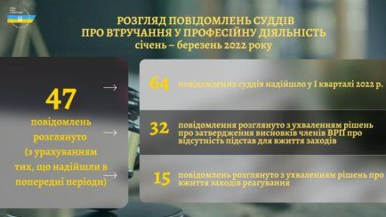 Протягом січня – березня 2022 року до ВРП надійшло 64 повідомлення про втручання у професійну діяльність суддів щодо здійснення правосуддя та дії, що порушують гарантії незалежності суддів або підривають авторитет правосуддя. З урахуванням повідомлень, які надійшли в попередні періоди, з початку 2022 року Рада розглянула47 повідомлень. За результатами розгляду 15 повідомлень про втручання в діяльність суддів щодо здійснення правосуддя ухвалено 14 рішень про вжиття заходів реагування: звернення до прокуратури та органів правопорядку стосовно надання інформації про розкриття та розслідування злочинів;внесення до відповідних органів чи посадових осіб подання про виявлення та притягнення до встановленої відповідальності осіб, якими вчинено дії або допущено бездіяльність, тощо. Розглянувши ...