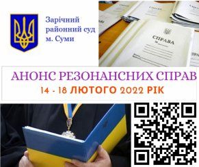 Детальніше: Анонс справ Зарічного районного суду м. Суми, які можуть становити суспільний інтерес