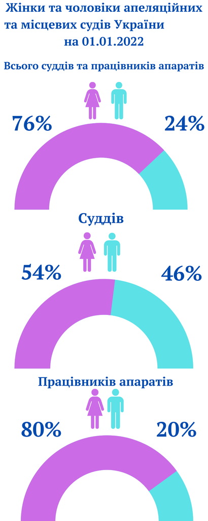 Державна судова адміністрація України на підставі інформації з програми "Кадри WEB" здійснилаузагальнення ґендерного складу апеляційних та місцевих судів України, Державної судової адміністрації України та її територіальних управлінь станом на 1 січня 2022 року, що розміщено на офіційному сайті ДСА України в окремій підрубриці "Питання ґендерної рівності". Державна судова адміністрація України За інформацією Судова влада України