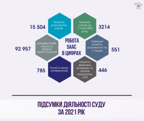 П'ятий апеляційний адміністративний суд опублікував підсумки роботи суду у 2021 році.Кількість розглянутих справ - 15 504Залишок справ на 1 січня 2022 рік - 3214Середня кількість розглянутих справ 1 суддею - 551Кількість звернень громадян та запитів юридичних осіб - 446Документообіг (вхідна+вихідна кореспонденція) - 92 957Кількість сеансів відеоконференцзв'язку - рекордні 785 Крім того, за цей рік у 5 ААС провели 28 комунікаційних заходів, серед яких: міжнародна конференція «Адміністративна процедура: нова сторінка у відносинах держави, громадян та бізнесу»;експертне обговорення "Між людиною та владою: еволюція адміністративної юстиції", присвячене святкуванню Днів адміністративної юстиції в Україні;семінар "Синергія трьох судових інстанцій як шлях до верховенства права та закону ...