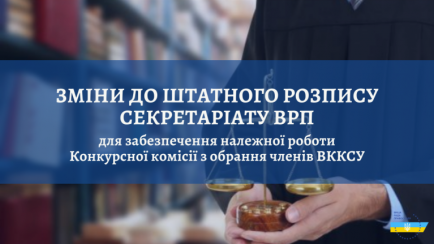 З метою залученням фахових працівників секретаріату Вищої ради правосуддя до організації належної роботи Конкурсної комісії з обрання членів Вищої кваліфікаційної комісії суддів України ВРП внесла зміни до штатного розпису секретаріату Ради. Вказані зміни будуть діяти з 1 грудня 2021 року. Відповідно до положень Закону України «Про судоустрій і статус суддів» у редакції Закону України № 1629-IX Конкурсна комісія є допоміжним органом ВРП, що утворюється для проведення конкурсу на зайняття посади члена ВККСУ та формування переліку кандидатів на посаду члена ВККСУ, які відповідають критеріям доброчесності та професійної компетентності. Організаційне та матеріально-технічне забезпечення діяльності Конкурсної комісії здійснює секретаріат Ради. Зокрема, секретаріат ВРП приймає документи ...