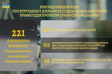 Такі дані наведені в інформаційно-аналітичній довідці про діяльність Вищої ради правосуддя, Дисциплінарних палат Вищої ради правосуддя та секретаріату Вищої ради правосуддя за січень – серпень 2021 року. Із початку року до ВРП надійшло 197 повідомлень про втручання у діяльність суддів щодо здійснення правосуддя та дії, що порушують гарантії незалежності суддів або підривають авторитет правосуддя. З урахуванням повідомлень, які надійшли в попередні періоди, за перші вісім місяців 2021 року Рада розглянула221 повідомлення. За результатами розгляду 68 повідомлень про втручання в діяльність суддів щодо здійснення правосуддя ухвалено 56 рішень про вжиття заходів реагування: · звернення до прокуратури та органів правопорядку стосовно надання інформації про розкриття ...