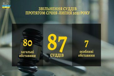 Такі дані наведені в інформаційно-аналітичній довідці про діяльність Вищої ради правосуддя, Дисциплінарних палат Вищої ради правосуддя та секретаріату Вищої ради правосуддя за січень – липень 2021 року. За загальними обставинами звільнено 80 суддів, а саме: - у зв’язку з поданням заяви про відставку – 79; - у зв’язку з поданням заяви про звільнення за власним бажанням – 1. За особливими обставинами звільнено 7 суддів, зокрема: - за вчинення істотного дисциплінарного поступку – 6; - за результатами кваліфікаційного оцінювання суддю визнано таким, що не відповідає займаній посаді (підпункт 4 пункту 161 розділу XV «Перехідні положення» Конституції України) – 1. За аналогічний період 2020 року звільнено 160 суддів: ...