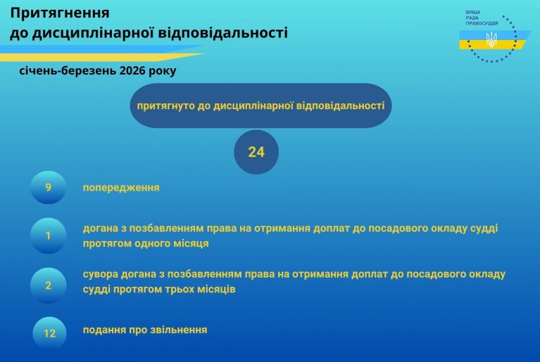 Детальніше: Протягом трьох місяців 2026 року до дисциплінарної відповідальності притягнуто 24 суддів