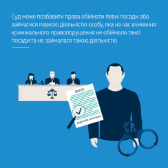 Згідно з положеннями ст. 55 КК України у випадку, коли санкцією відповідної частини статті Особливої частини КК України передбачено можливість призначення особі додаткового покарання у виді позбавлення права обіймати певні посади або займатися певною діяльністю, суд, визнаючи особу винуватою у вчиненні відповідного кримінального правопорушення, має право призначити таке додаткове покарання незалежно від того, чи обвинувачений обіймав певну посаду або займався певною діяльністю на час вчинення кримінального правопорушення.