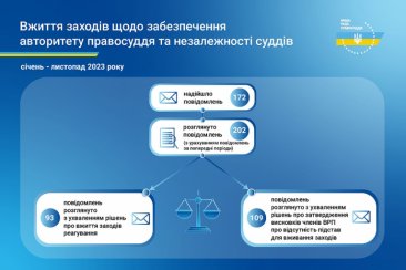 172 повідомлення про втручання у професійну діяльність суддів щодо здійснення правосуддя та дії, що порушують гарантії незалежності суддів або підривають авторитет правосуддя, надійшло до Вищої ради правосуддя упродовж одинадцяти місяців 2023 року. З урахуванням повідомлень, які надійшли за попередні періоди, ВРП з початку цього року розглянула 202 повідомлення суддів.