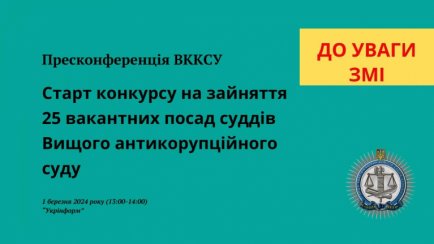 Вища кваліфікаційна комісія суддів України запрошує представників медіа взяти участь 1 березня 2024 року у пресконференції ВККСУ на тему: «Старт конкурсу на зайняття 25 вакантних посад суддів Вищого антикорупційного суду».