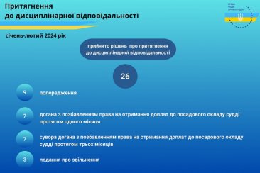 Упродовж січня – лютого 2024 року за результатами розгляду дисциплінарних справ Дисциплінарні палати Вищої ради правосуддя прийняли 26 рішень про притягнення до дисциплінарної відповідальності 26 суддів та застосування до них таких видів дисциплінарних стягнень: