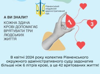 Колектив Рівненського окружного адміністративного суду у квітні 2024 рокуздав більше 6 літрів крові для потреб поранених бійців ЗСУ та пацієнтів лікрень.