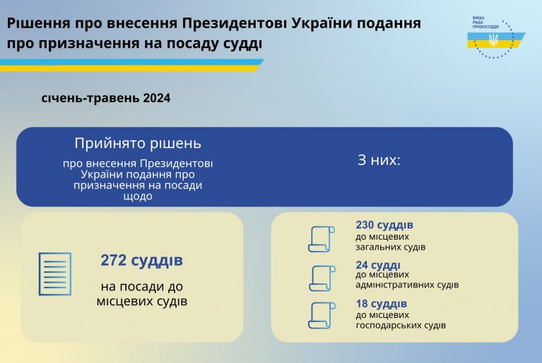 Упродовж січня - травня 2024 року Вища рада правосуддя ухвалила рішення про внесення Президентові України подання про призначення на посади 171 судді до місцевих судів, з них: