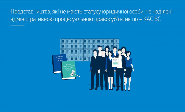 КАС ВС вказав, що представництва утворюються для виконання допоміжних операцій поза місцем знаходження самої юридичної особи в тих місцях, де знаходження такого представництва забезпечить зручність налагодження зв’язків, виконання певних дій, на які воно уповноважене юридичною особою, в тому числі виконання юридичних дій. На відміну від філій, представництва не виконують фактичних дій, компетенція їх обмежена виконанням юридичних дій від імені юридичної особи. Представництва не визнаються суб’єктами цивільного права, а їх посадові особи можуть діяти від імені юридичної особи. Відповідальність за дії представництв і їх посадових осіб несе юридична особа, яка утворила ці представництва.