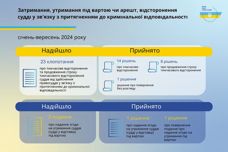 Протягом трьох кварталів 2024 року до ВРП надійшло 2 подання про надання згоди на утримання судді під вартою, за результатами розгляду яких Радою прийнято 1 рішення про надання згоди на утримання під вартою судді та 1 рішення про повернення подання про надання згоди на утримання під вартою у зв’язку з невідповідністю вимогам закону України «Про Вищу раду правосуддя».