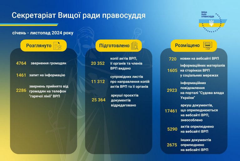 Протягом січня – листопада 2024 року на офіційному вебсайті Вищої ради правосуддя оприлюднено: 5290 актів ВРП, 2675 інших документів, 720 новин та повідомлень; у соціальних мережах ВРП розміщено 1605 інформаційних матеріалів.