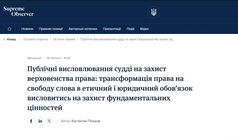 Читайте статтю за посиланням: https://so.supreme.court.gov.ua/authors/1045/publichni-vyslovliuvannia-suddi-na-zakhyst-verkhovenstva-prava-transformatsiia-prava-na-svobodu-slova-v-etychnii-i-iurydychnyi-oboviazok-vyslovytys-na-zakhyst-fundamentalnykh-tsinnostei