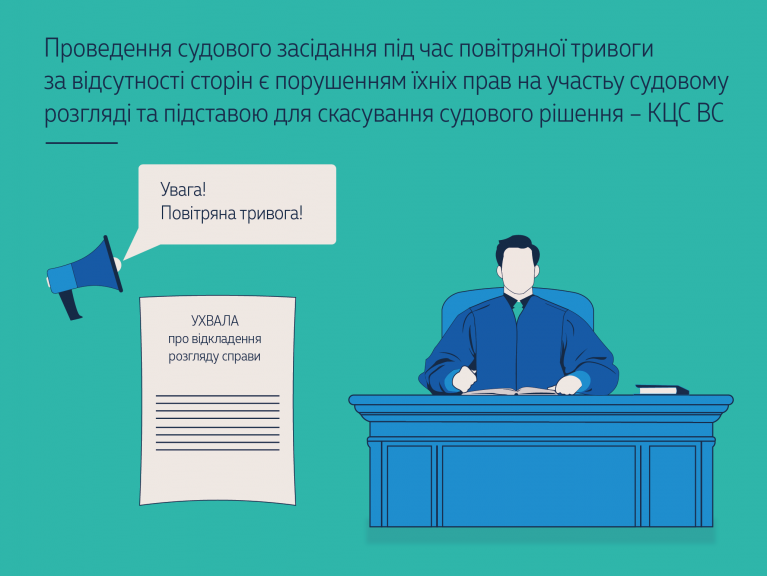 Скасовуючи постанову апеляційного суду та направляючи справу на новий апеляційний розгляд, КЦС ВС виснував, що, вирішуючи питання про наявність підстав для відкладення розгляду справи, в якій на початок судового засідання оголошено сигнал «Повітряна тривога», суд має керуватися пріоритетом збереження життя і здоров’я людини, а обов’язком суду є сприяти учасникам судового процесу в реалізації ними процесуальних прав, зокрема на участь у судовому розгляді, та виходити з того, що відсутній учасник справи не з'явився в судове засідання з об’єктивних і поважних причин, якщо немає клопотання про розгляд справи за його відсутності.