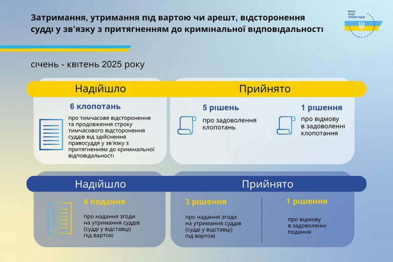 Упродовж чотирьох місяців 2025 року до ВРП надійшло 4 подання про надання згоди на затримання судді та утримання його під вартою, за результатами розгляду яких Радою прийнято: