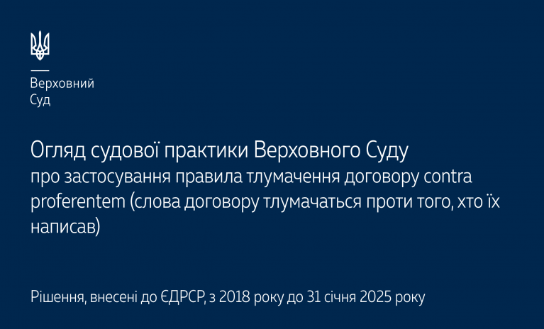 Пропонуємо до уваги огляд судової практики Верховного Суду щодо застосування доктрини contra proferentem – правила тлумачення неясних або суперечливих умов договору проти сторони, яка їх сформулювала, чи коли сторона скористалася стандартною умовою, що була розроблена третьою особою: https://court.gov.ua/storage/portal/supreme/ogliady/Oglyad_contra_proferentem_2018_2025.pdf.