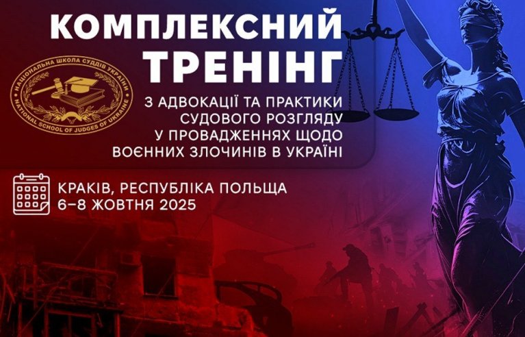 6–8 жовтня 2025 року Національна школа суддів України спільно із Програмою "Розвиток компетентностей для правничого сектору України" проводить дводенний тренінг з адвокації та практики судового розгляду у провадженнях щодо воєнних злочинів в Україні (Краків, Республіка Польща).