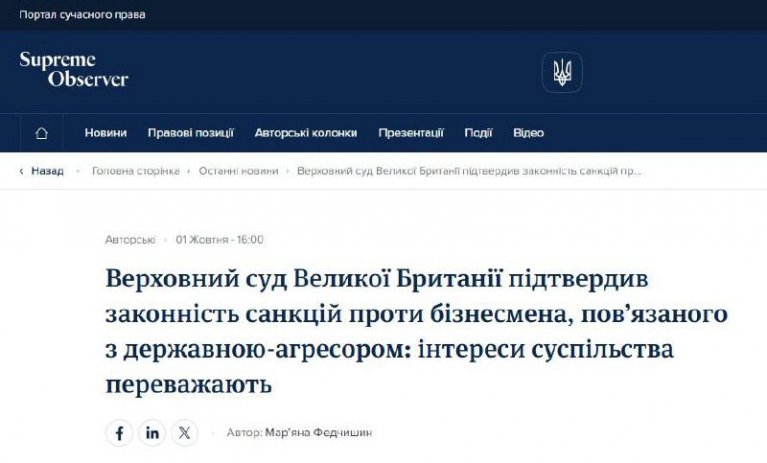 Верховний суд Великої Британії ухвалив рішення, яким відмовив заявникам у скасуванні санкцій, застосованих через російську агресію проти України (Shvidler v. Secretary of State for Foreign, Commonwealth and Development Affairs / Dalston Projects Ltd and others v. Secretary of State for Transport [2025] UKSC 30).