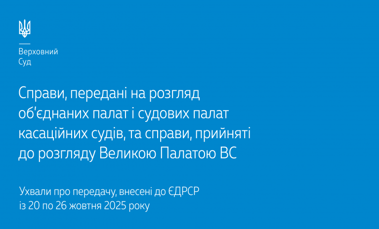 Цього тижня знайомимо вас зі справами, переданими на розгляд об’єднаних палат і судових палат касаційних судів, а також зі справами, прийнятими на розгляд Великої Палати ВС відповідно до ухвал про передачу, внесених до ЄДРСР із 20 по 26 жовтня 2025 року.