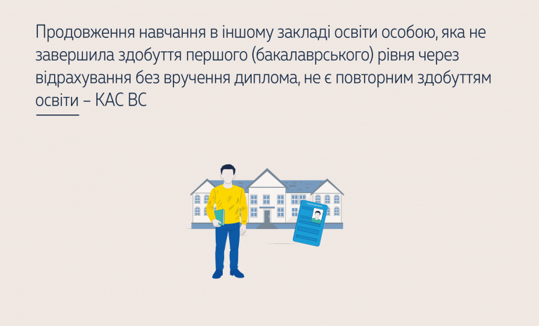 З’ясовані судовим розглядом цієї справи обставини підтверджують, що позивач раніше не отримував жодного документа про вищу освіту, у тому числі за ступенем вищої освіти – бакалавр. Тобто позивач у цьому випадку фактично продовжив навчання в іншому вищому навчальному закладі з того ж самого курсу, з якого він був відрахований з попереднього навчального закладу, та за тією ж спеціальністю і освітньою програмою, що спростовує підтримані судами попередніх інстанцій доводи відповідача про те, що в цьому випадку мало місце повторне отримання позивачем одних і тих самих освітніх послуг та повторне формування відповідних знань, умінь, навичок і загальних компетентностей на тому самому рівні вищої освіти. Тому Верховний Суд скасував судові рішення судів нижчих інстанцій, які відмовили в задоволенні позову, зазначивши, зокрема, що повторне зарахування – це якщо особа знову формуватиме такі знання, уміння, навички та загальні компетентності на тому самому рівні вищої освіти.