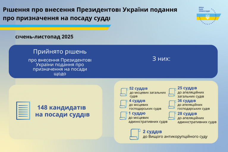 Протягом січня – листопада 2025 року Вища рада правосуддя ухвалила рішення про внесення Президентові України подання про призначення 148 кандидатів на посади суддів, з них: