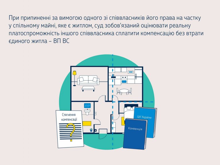 Переглядаючи рішення судів, Велика Палата ВС дійшла висновку, що під час вирішення спорів за вимогою одного зі співвласників про припинення його права на частку у спільному майні, яким є житло, шляхом отримання від інших співвласників грошової компенсації вартості його частки, виділ якої є неможливим, підлягає врахуванню майновий стан відповідача (відповідачів), а саме можливість сплатити компенсації вартості частки, право позивача на яку припиняється та передається відповідачу (відповідачам), та те, чи не призведе виконання відповідного рішення про стягнення компенсації до звернення стягнення на ту частку, право на яку передано іншим співвласникам відповідним судовим рішенням.