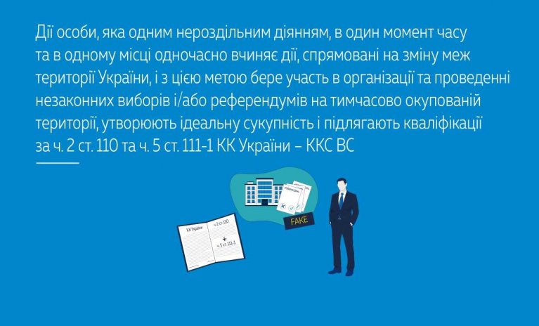 Дії особи, яка одним нероздільним діянням, в один момент часу та в одному місці одночасно вчиняє дії, спрямовані на зміну меж території України, і з цією метою бере участь в організації та проведенні незаконних виборів і/або референдумів на тимчасово окупованій території, утворюють ідеальну сукупність і підлягають кваліфікації за ч. 2 ст. 110 та ч. 5 ст. 111-1 КК України.