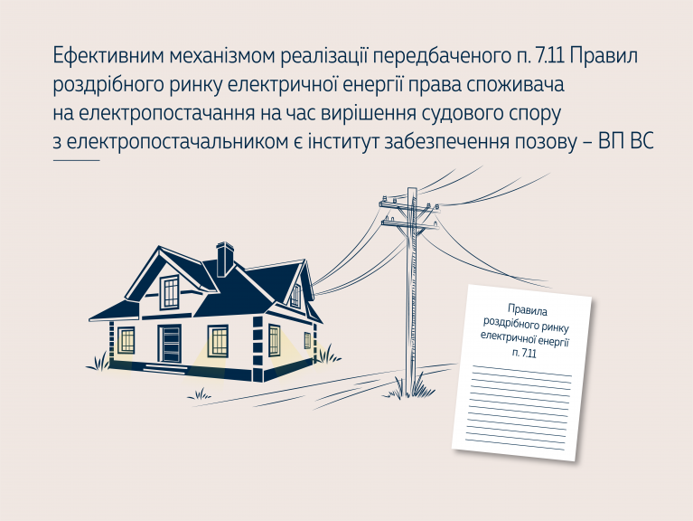 З урахуванням наведеного, а також критеріїв застосування норми абз. 4 п. 7.11 ПРРЕЕ Велика Палата ВС виснувала, що у випадку звернення споживача до суду за захистом своїх прав безальтернативним та найефективнішим для практичного застосування п. 7.11 ПРРЕЕ є механізм забезпечення позову з огляду на зміст цієї норми права, а саме постановлення ухвали про заборону відключення електропостачання такого споживача на час вирішення справи про оскарження факту порушення споживачем цих Правил та/або умов договорів.