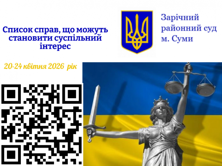 22.04.2026 на 16 год 00 хв кримінальне провадження № 591/2125/26 стосовно директорки однієї з місцевих шкіл, яку обвинувачено в службовій недбалості (ч. 2 ст. 367 КК України).