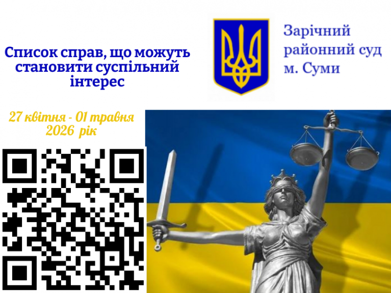 28.04.2026 на 13 год 30 хв кримінальне провадження № 591/10361/23 за обвинуваченням громадянина Б. та громадянки С. у зловживанні службовим становищем (ч. 2 ст. 28, ч. 2 ст. 364 КК України). Також чоловіка обвинувачено у службовій недбалості (ч. 1 ст. 367 КК України).