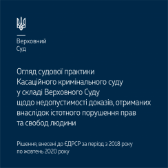 Огляд містить ряд важливих правових позицій Касаційного кримінального суду у складі Верховного Суду щодо застосування норм кримінального процесуального права в частині визнання недопустимими доказів, отриманих внаслідок істотного порушення прав та свобод людини станом на жовтень 2020 року, зокрема, про: