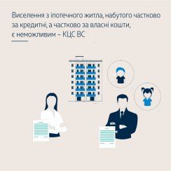 Згідно з нормами ст. 109 ЖК Української РСР та ст. 379 ЦК України у поєднанні із гл. 26 ЦК України виселення без надання іншого житлового приміщення відбувається в тому разі, якщо саме це житлове приміщення було придбане за кредитні кошти. Якщо за кредитні кошти було набуто інший об'єкт цивільних прав (частку в праві спільної часткової власності), а не житлове приміщення в цілому, що передано в іпотеку, то виселення без одночасного надання іншого постійного жилого приміщення не допускається.