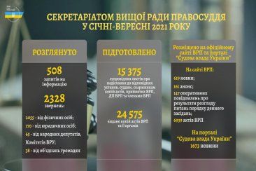 Протягом січня – вересня 2021 року секретаріатом Вищої ради правосуддя розглянуто 2328 звернень: 2055 – від фізичних осіб, 170 – від юридичних осіб, 65 – від народних депутатів України та комітетів Верховної Ради України, 38 – від об’єднань громадян, а також 508 запитів на інформацію.