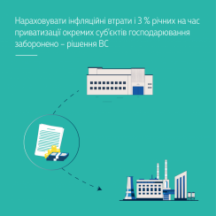 Господарський суд Дніпропетровської області, з яким погодився Центральний апеляційний господарський суд, частково задовольнив позов Комунального підприємства «Кривбасводоканал» і стягнув з АТ «Криворізька теплоцентраль» на користь КП «Кривбасводоканал» 3 % річних і втрати від інфляції, нараховані за порушення виконання грошового зобов’язання з оплати боргу, оскільки обмеження щодо їх нарахування для підприємств, включених до переліку підприємств, що підлягають приватизації, діють із моменту набрання чинності норм, якими введено ці обмеження, – із 7 березня 2018 року. Тобто у спірний період положення п. 4-3 розд. X «Прикінцеві та перехідні положення» Закону України «Про відновлення платоспроможності боржника або визнання його банкрутом» (Закон про банкрутство) щодо відповідача не діяли.