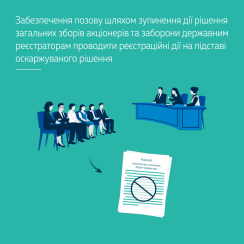 Акціонер ПрАТ звернувся з позовом до ПрАТ про визнання недійсним рішення позачергових загальних зборів цього товариства. Одночасно з позовом подано заяву про вжиття заходів забезпечення позову шляхом зупинення дії оскаржуваного у справі рішення і заборони державним реєстраторам проводити реєстраційні дії на підставі оскаржуваного рішення.