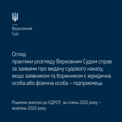 Пропонуємо до уваги огляд практики розгляду Верховним Судом справ за заявами про видачу судового наказу, якщо заявником та боржником є юридична особа або фізична особа – підприємець (рішення, внесені до ЄДРСР, за січень 2021 року – жовтень 2022 року) – .