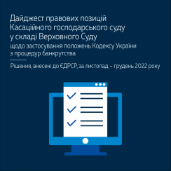 Пропонуємо до уваги дайджест правових позицій Касаційного господарського суду у складі Верховного Суду щодо застосування положень Кодексу України з процедур банкрутства (рішення, внесені до ЄДРСР за листопад – грудень 2022 року) – .