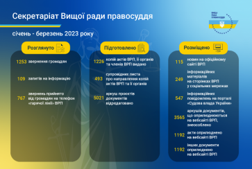 Протягом першого кварталу 2023 року співробітниками секретаріату Вищої ради правосуддя опрацьовано 1253 звернення громадян та 109 запитів на інформацію.