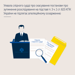 Касаційний кримінальний суд у складі Верховного Суду залишив без зміни ухвалу апеляційного суду, зауваживши, що ухвала слідчого судді про скасування постанови слідчого про зупинення досудового розслідування на підставі п. 3 ч. 1 ст. 615 КПК України не підлягає окремому апеляційному оскарженню.